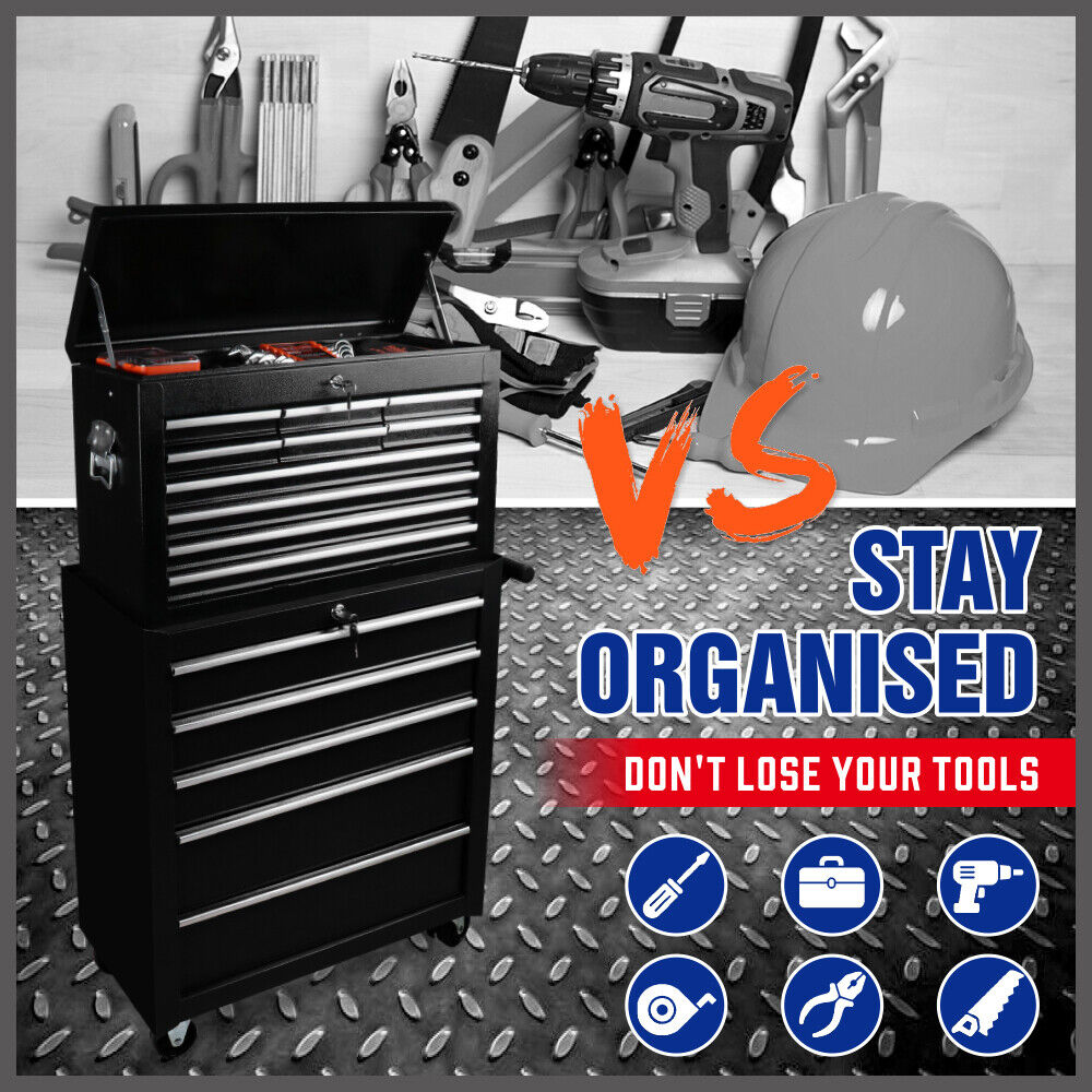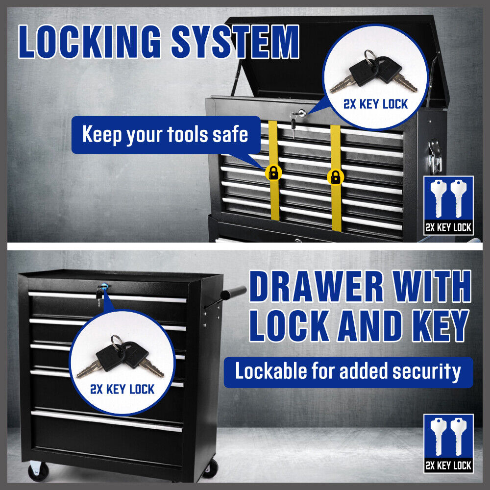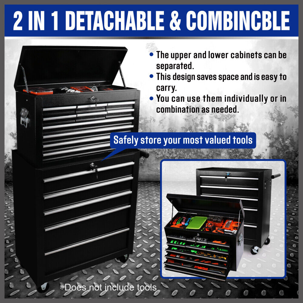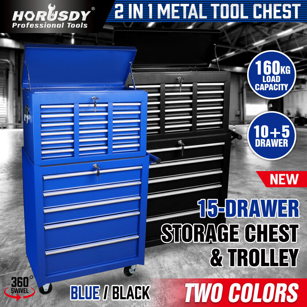 The HORUSDY 15-Drawer Tool Box Trolley Cabinet is a versatile storage solution made of powder-coated steel. Its 2-in-1 design allows you to detach and combine the upper and lower cabinets as needed, saving space and providing easy portability. Each drawer is equipped with a lock and key for added security, ensuring your valuable tools are safely stored. The drawers feature non-slip liners to protect your tools and keep them in place. With its solid steel frame and smooth ball-bearing slides, this tool trolley offers durability and easy access to your tools. The omni-directional casters, including a brake, enable effortless movement and stability.