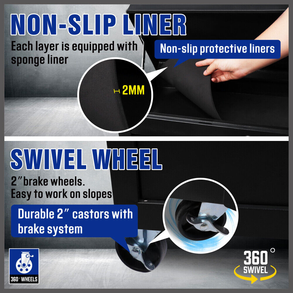 - Non-slip liners in each drawer for tool protection and stability.