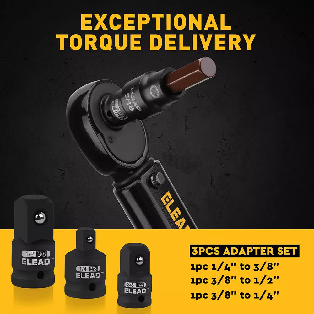 Multi-size Coverage This 16-piece set covers all your needs, including 1/4" drive (5/64, 3/32, 1/8, 5/32, 3/16, 7/32, 1/4), 3/8" drive (9/32, 5/16, 3/8, 7/16, 1/2), and 1/2" drive (9/16), plus 3 socket adapters. Each socket features a detent pin hole for added stability and precision.