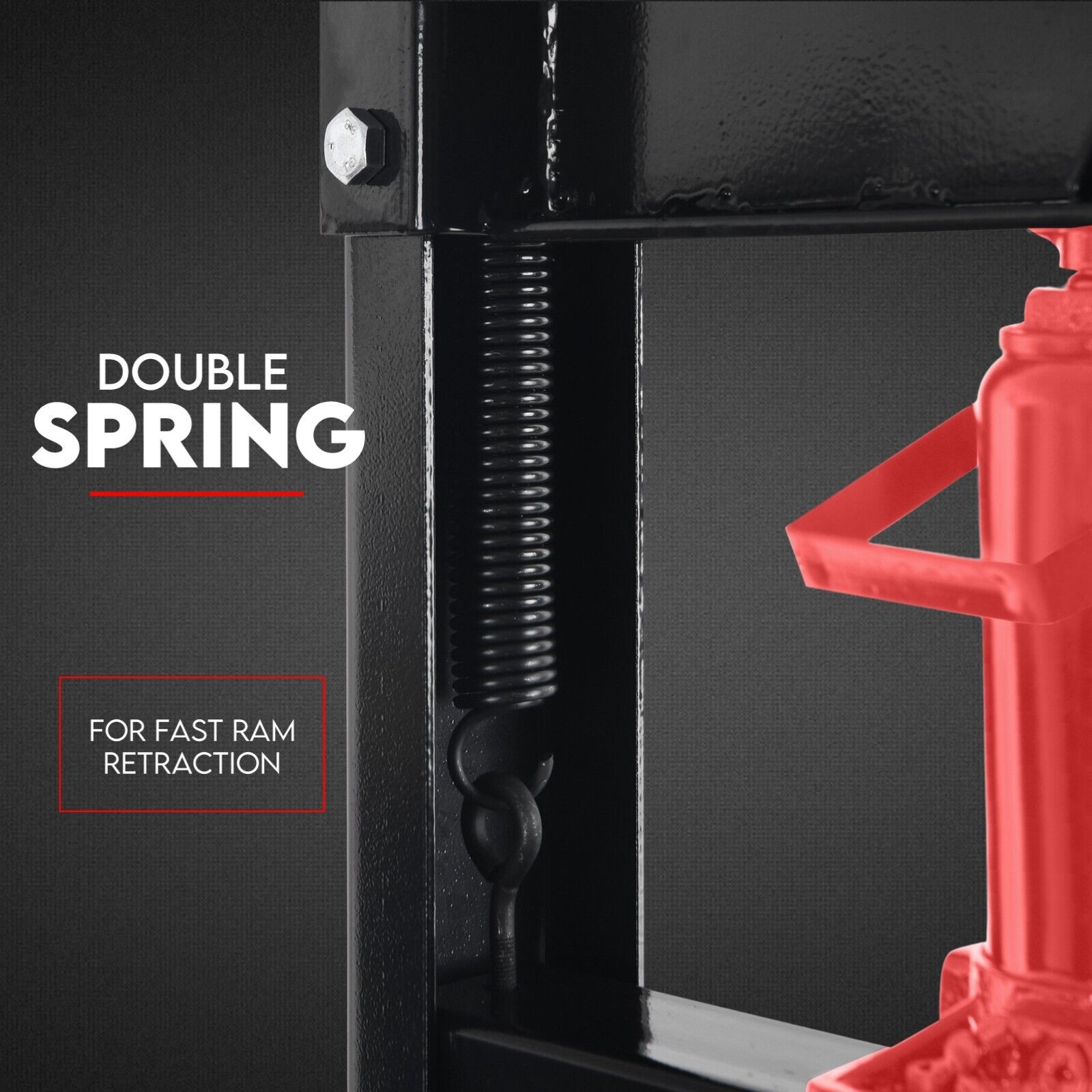 Its bottle jack produces 20 tonnes of continuous pressing force and may be used with the manual hand pump. The dual ram return tension springs ensure smooth and safe operation and can slide along the top of the press to adjust horizontally and extends from its base.
