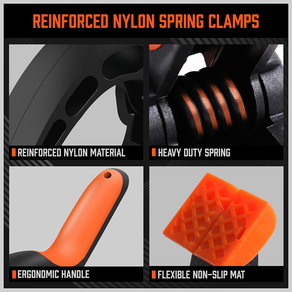 - 20-piece nylon spring clamp set with 3.5-inch clamps (x10), 4.3-inch clamps (x6), and 6.3-inch clamps (x4)