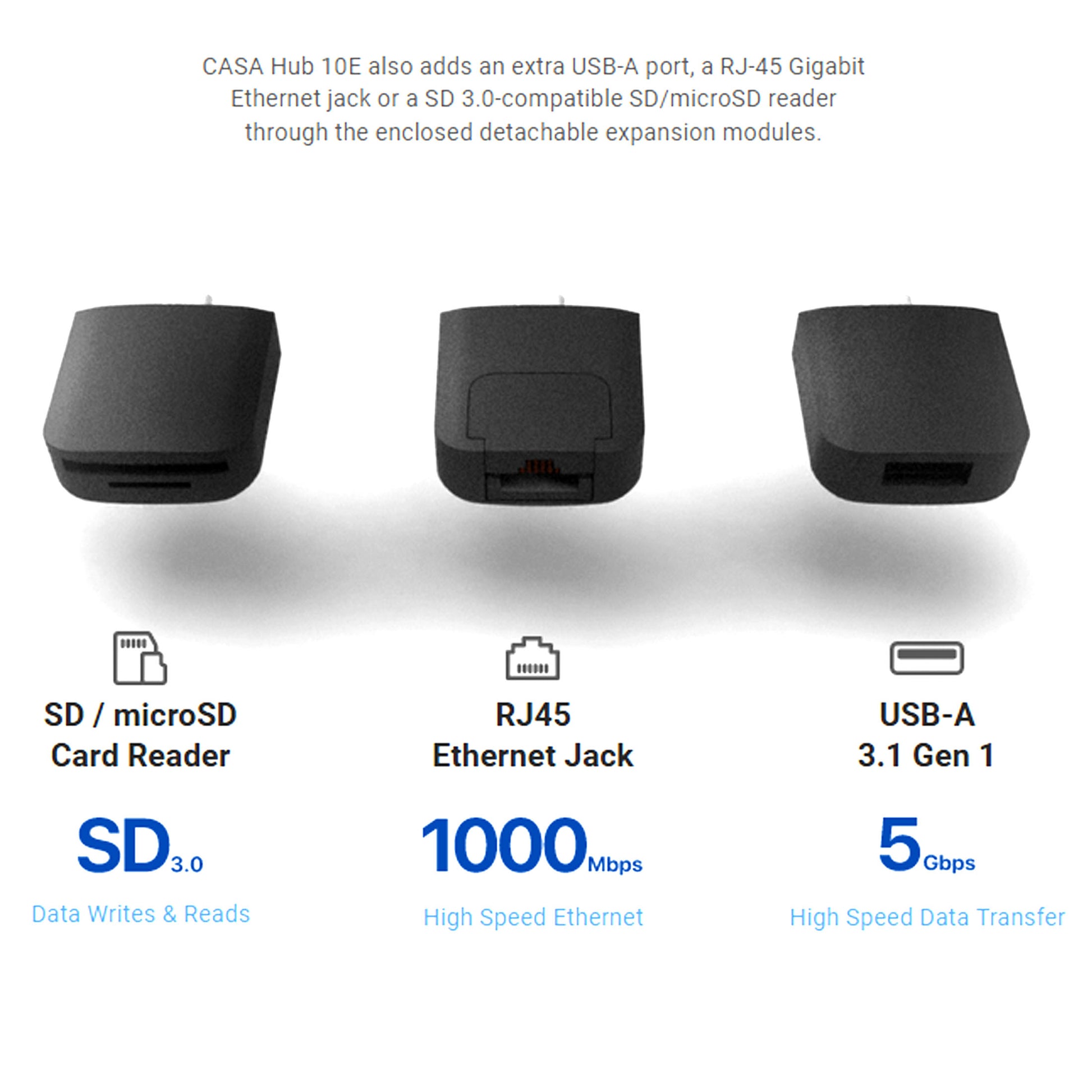EXPANDABLE with 3 included modules for Ethernet, SD/ microSD card readers and an extra USB 3.1 port - remove the modules to free up 2 extra USB-C 3.1 ports.