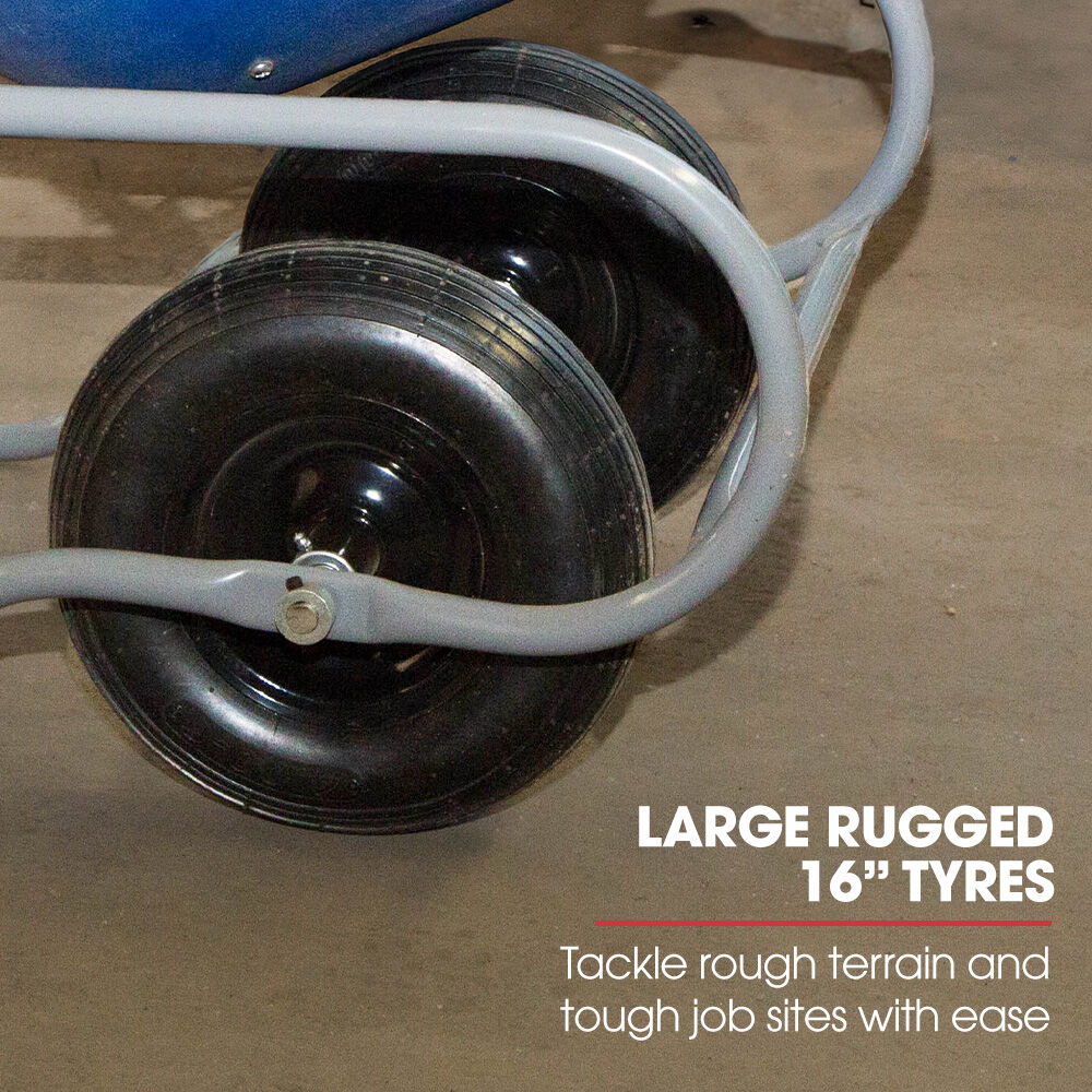 Designed for real job sites, the large 16” pneumatic tyres roll over rough terrain with ease, and the powder-coated steel frame is built to handle tough conditions.