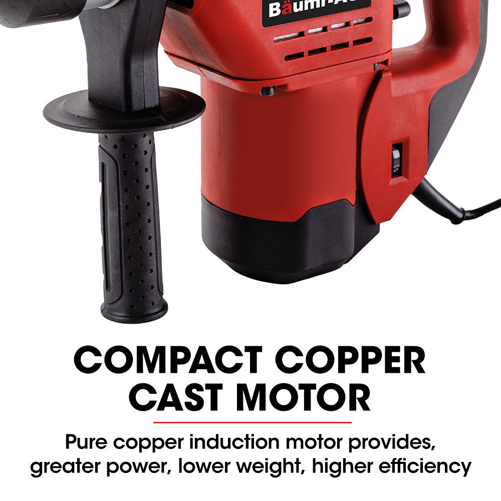 The Baumr-AG 1500W SDS Plus is packed with high-quality parts and professional features, including heavy-duty bearings, hardened steel crank and gear set, and ergonomic handles to limit vibration and reduce user fatigue. The most important of these is a lightweight, balanced, professional-grade, compact, 1500 watt, copper cast, induction motor.