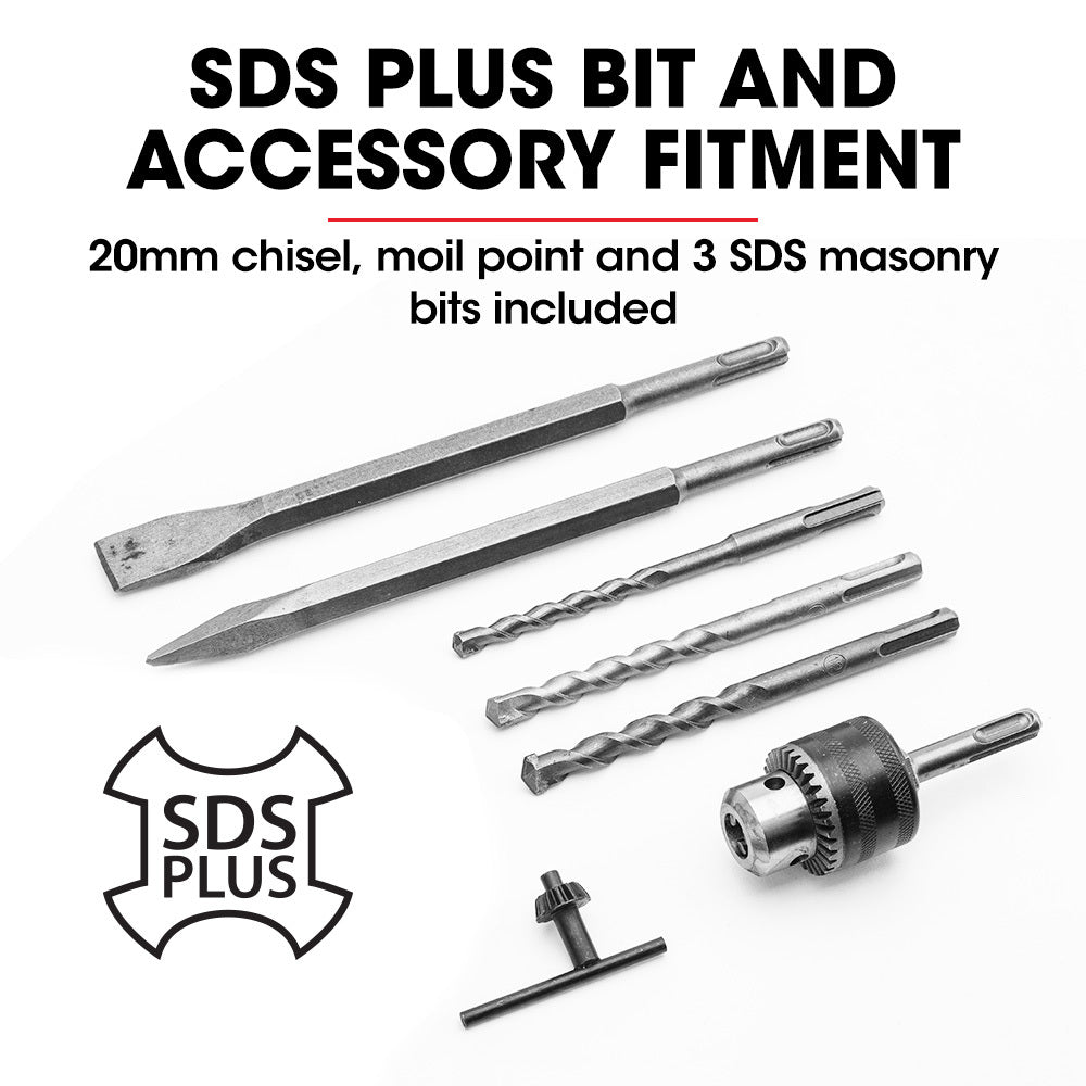 - Drill Bits: SDS Plus with standard chuck adaptor and key included