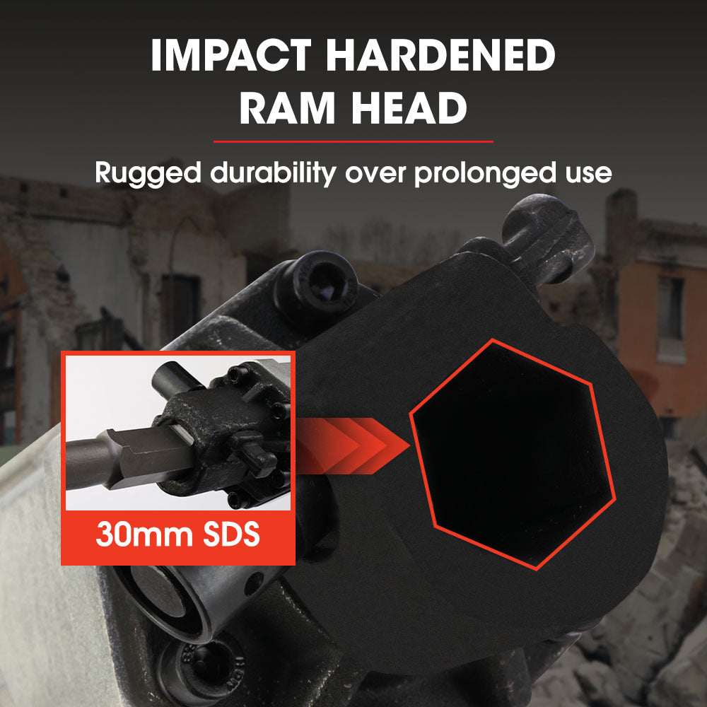 At 1500 BPM it has 55J of energy transfer at impact. Ensuring that no task is too much for this tough compact powerhouse. The case hardened steel body and Baumr-AGâs exclusive Air-Flex anti-vibration handles protect you from excess vibration. It has a 30mm SDS bit connection that accepts most standard bits.