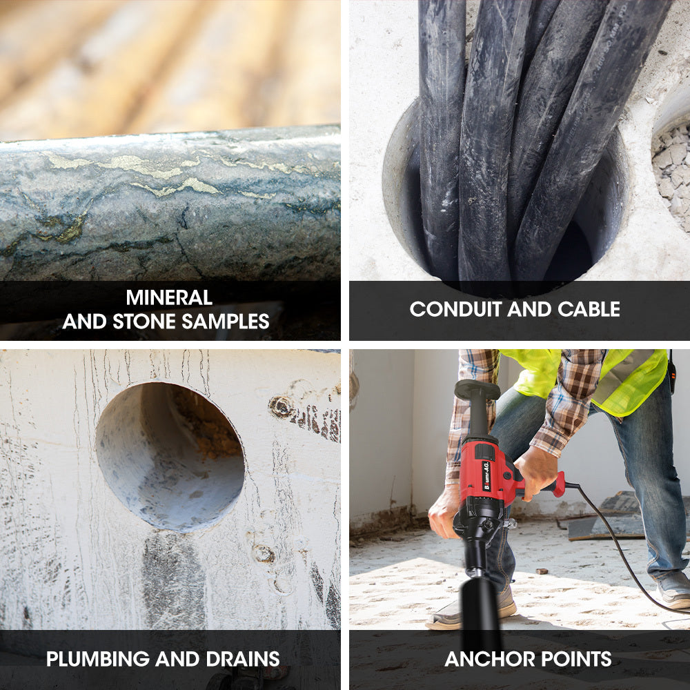 Prepare to be blown away by the versatility, power, and precision of this Diamond Core Wet/Dry Drilling Rig. Whether demolition, drilling, digging, punching or mixing, this powerhouse is your trusted companion for every task. From installing HVAC lines, running conduits, punching holes for pipes, erecting stair railings, mineral sampling and even repairing sewers or highways, this machine exceeds expectations.