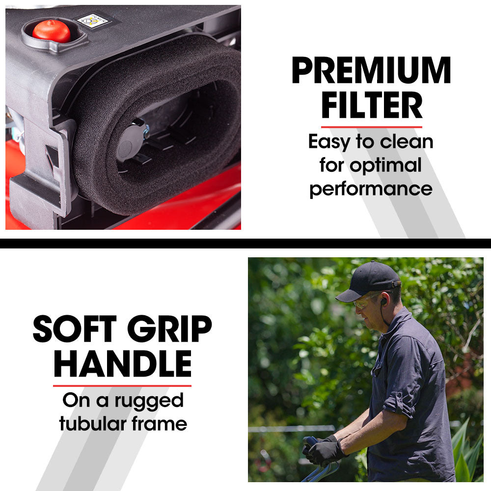 The 840SX lawn mower boasts high quality components which includes advanced four-stroke OHV technology that blends a high power output with easy starting and efficiency. The effortlessly powerful air cooled 220cc engine slices through the toughest buffalo with ease.