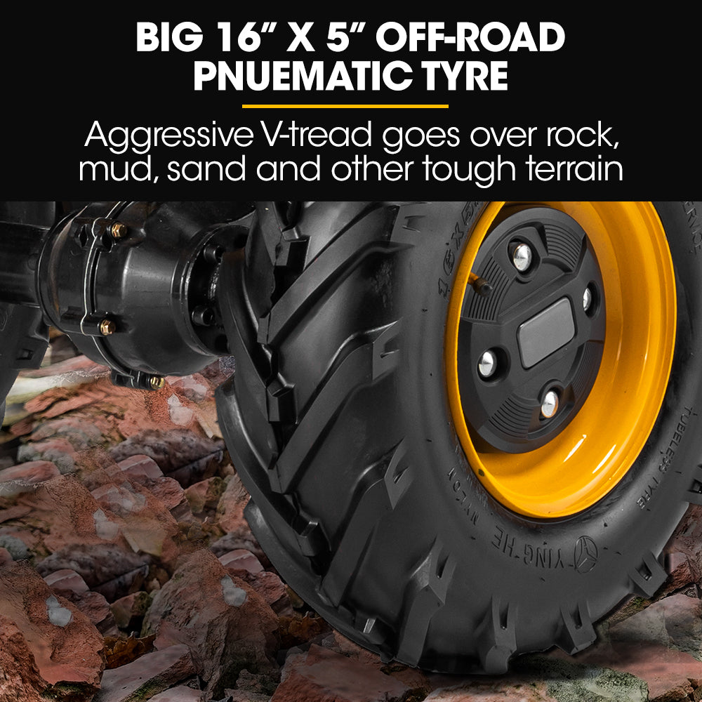 - The dual 16” aggressive deep V-tread tyre provides superior traction for exceptional performance on challenging terrains