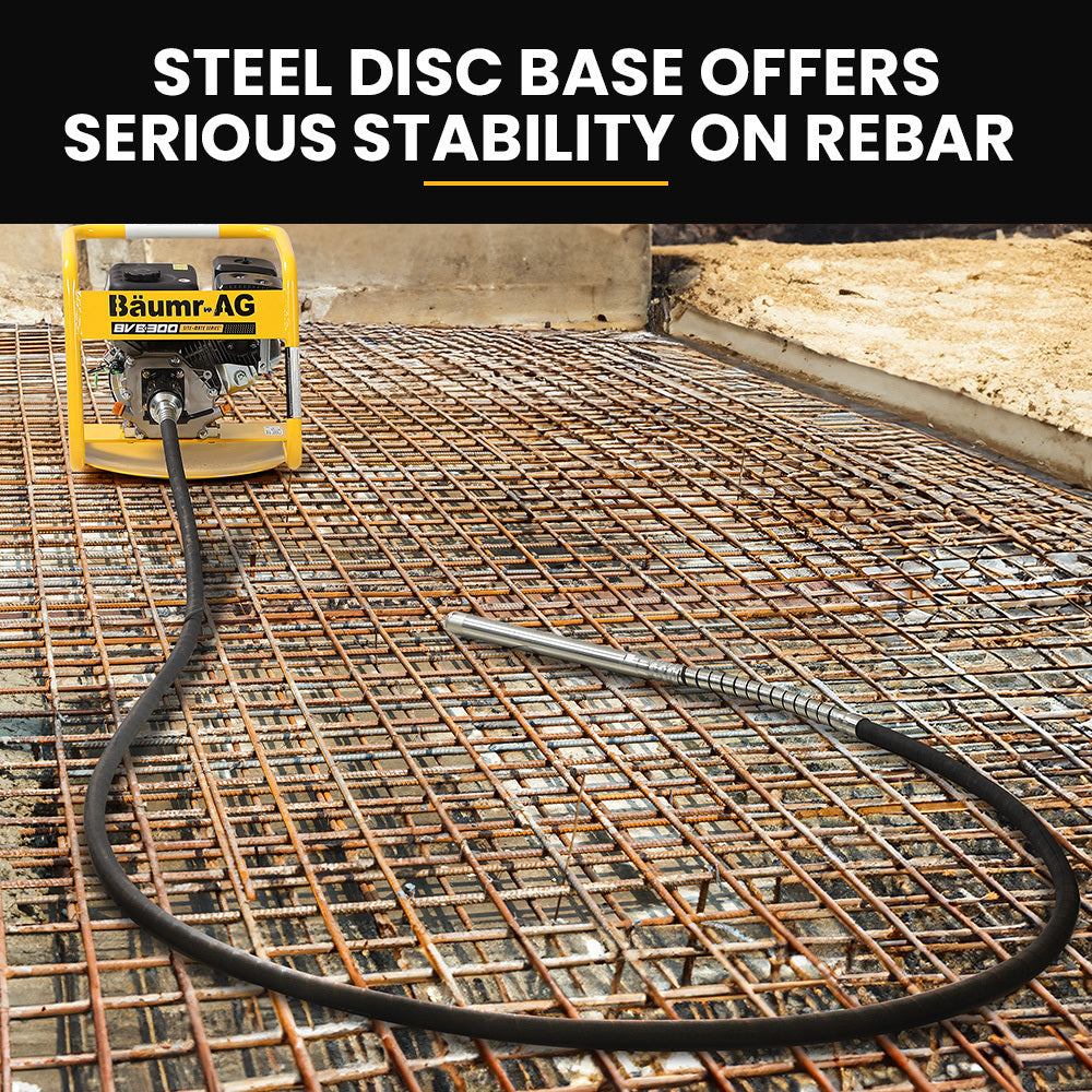 This Baumr-AG BVB-300 Drive Unit and Concrete/Cement Flexible Vibrator Poker Combo is powered by a 196cc 6.5HP overhead valve engine. The BVB-300 is a formidable unit boasting an Ezy-Pull recoil start for effortless ignition. With a broad disc on the base, it provides stability when resting on rebar, while still allowing it to pivot. This feature allows you to cover a larger area when settling concrete without having to move the drive unit.
