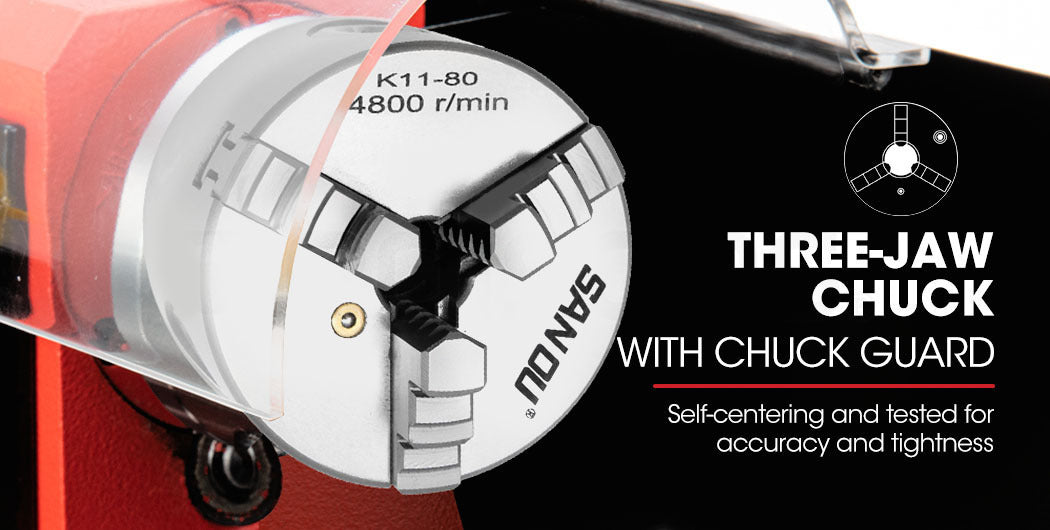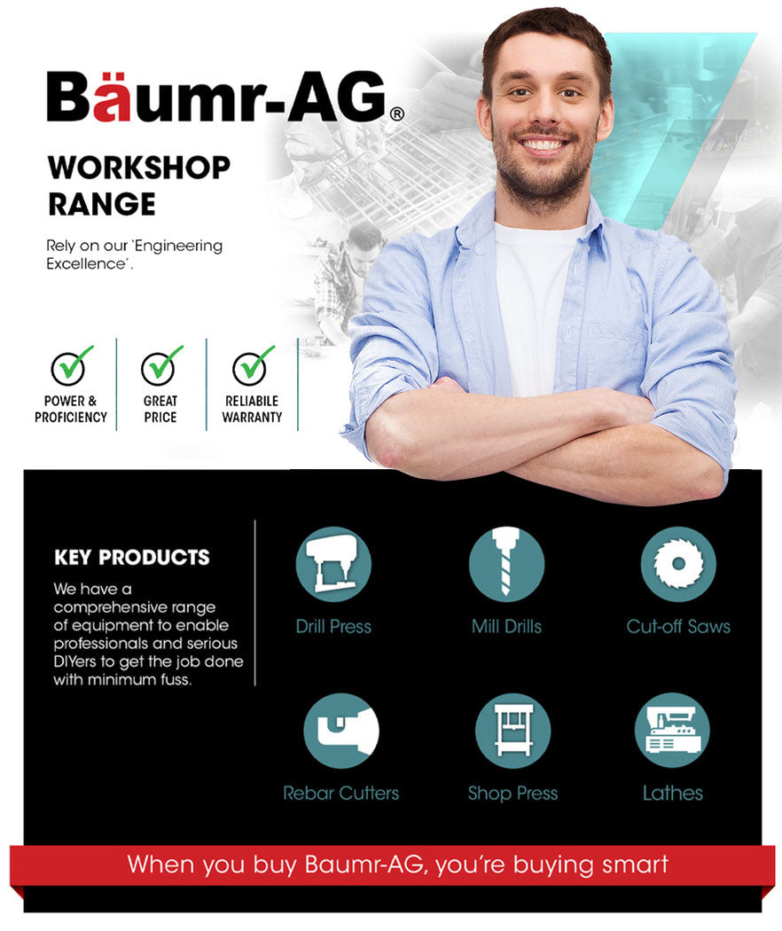 It has a fully-featured carriage, finely machined ways, self-centring 3-jaw chuck, a MT3 spindle taper and a MT2 tailstock taper and includes a thread range of 0.4-2.0mm (10 thread pitches). The 5/16-inch capacity tool post allows up to four cutting tools to be mounted at once for simple substitutions mid-project. The Baumr-AG has a chip tray splash guard and emergency stop button for optimal safety credentials. Plus, it also has a digital LCD display for accurate viewing of current RPM.