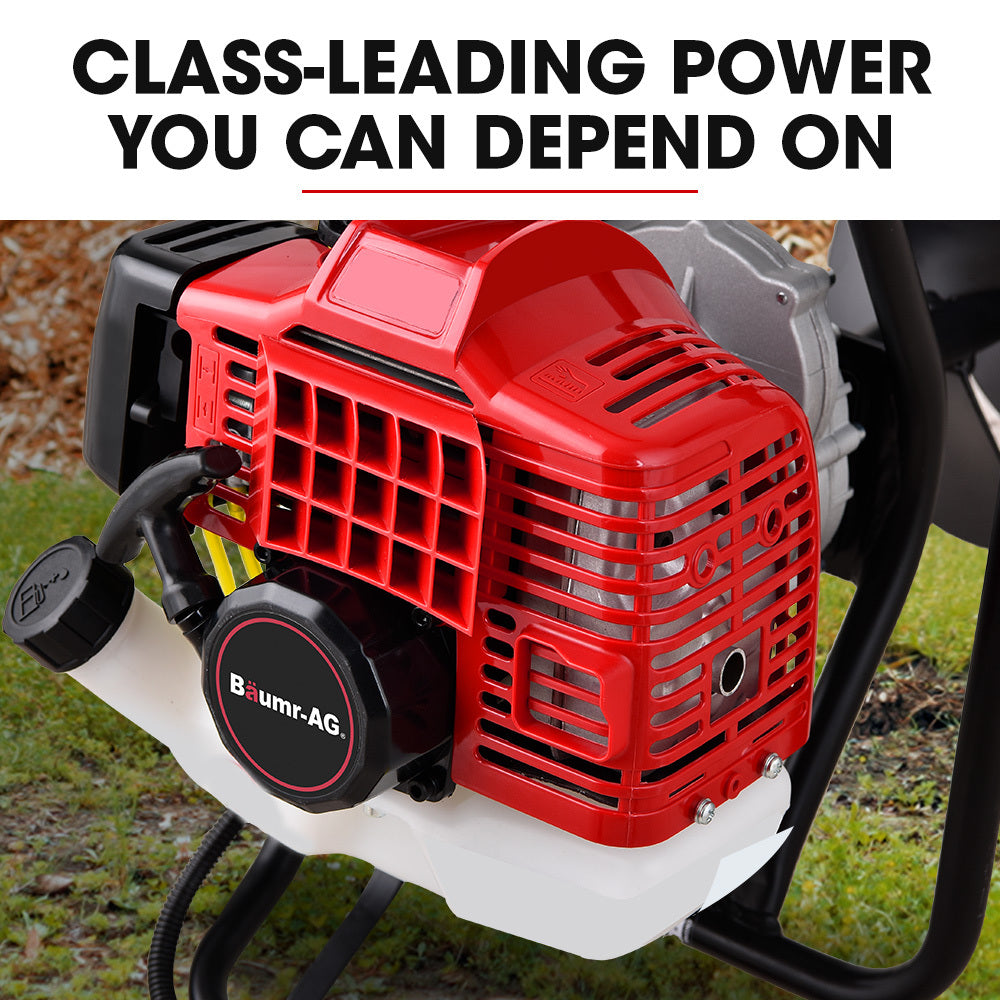 The BPX-1200 Baumr-AG Post Hole Digger is equipped with an easy starting 2-stroke petrol engine, recognized for its impressive power. What truly sets it apart is the innovative thigh-operated safety stop brake that swiftly cuts operation in the event of making contact with a foreign object in the ground.