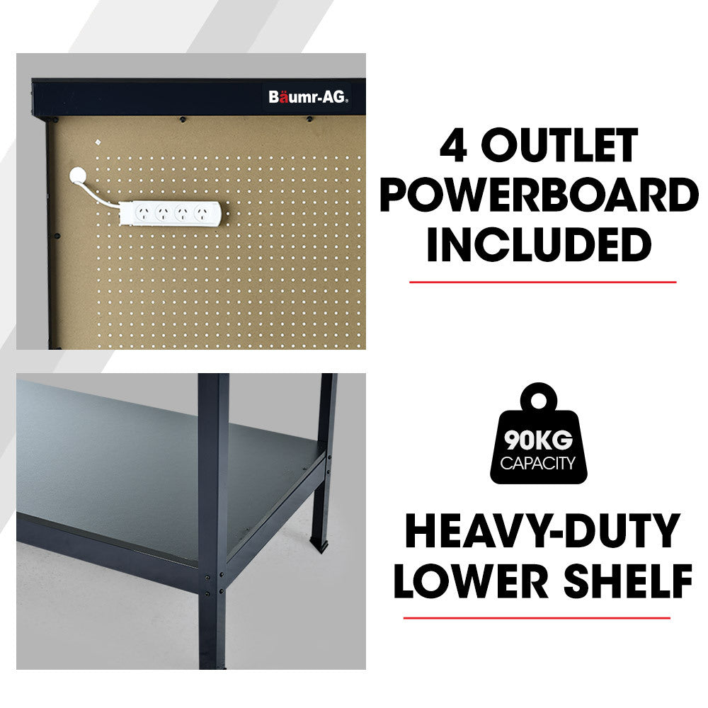 The Baumr-AG multi-purpose work bench has an integrated LED worklight for optimal visibility in any room. It also comes complete with a four socket 10 amp power board that you can attach wherever you like on the pegboard. Charging and powering your tools and accessories now couldn’t be easier—making the Baumr-AG work bench a great all-arounder for any home garage or workshop.