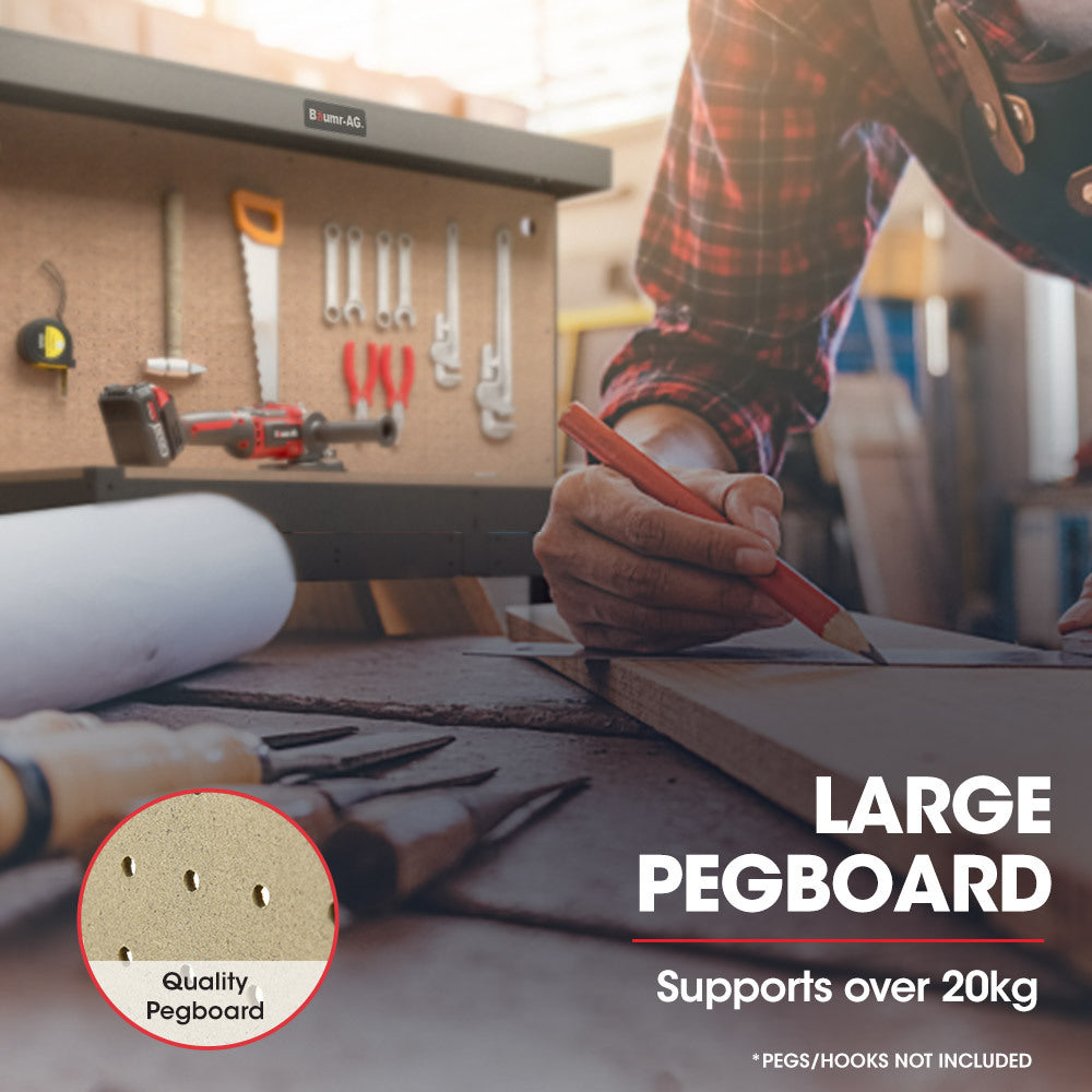 The Baumr-AG Multipurpose Workbench with Work Light has everything you need to keep your workspace organised and functioning smoothly. It has an impressive 250kg total capacity distributed between pegboard, drawers, benchtop, and bottom shelf. The entire steel frame is enamel coated to resist corrosion and prevent damage from any chemical spills.