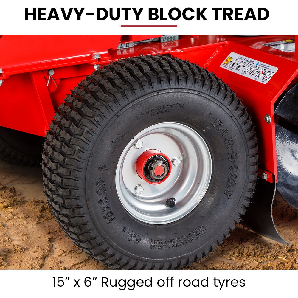 Baumr-AG has engineered this trencher with premium components. The tungsten carbide digging teeth are mounted on a heavy-duty chain. They are driven by a hardened steel rear sprocket. The centrifugal clutch and adjustable throttle digging system prevent over-torque and machine kicking. The front and rear grease nipples are great for easy maintenance of machine components. The XL 15" x 6" extra-wide all-terrain tyres handle rough terrain effortlessly.