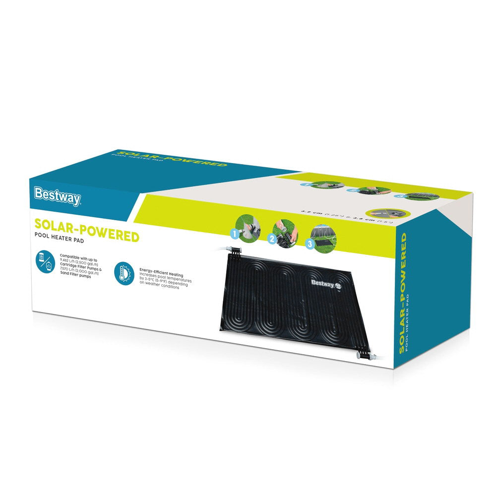 Warm your pool the natural way with this Bestway Solar Heater Pad! The 110cm x 171cm panel boosts water temperature by 3-5°C using free solar energy. Easy to install with included 32mm & 38mm adapters - simply connect to your filter system (works with cartridge pumps maximum 9,462L/h and sand pumps maximum 8,327L/h). Durable construction handles Aussie weather conditions. Multiple units can be joined for larger pools. No electricity needed - just let the sun do the work! Enjoy warmer swims for longer this season.