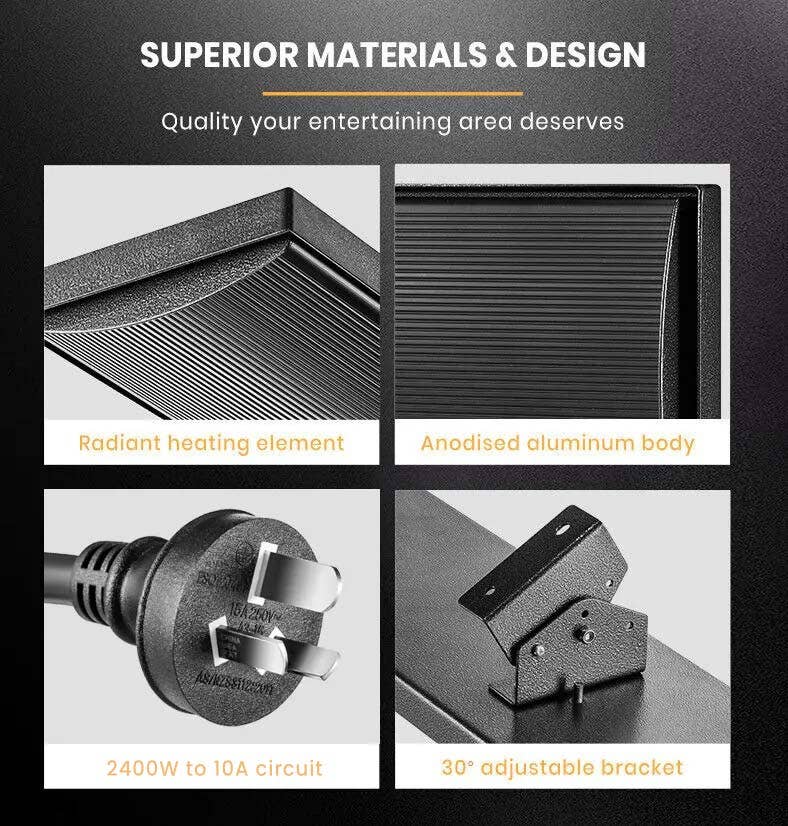 A 3200 watt electric element is embedded in the black anodised aluminium strip that rapidly produces even and gentle heat dispersion. Plus, unlike gas heaters there is no glow or glare, and no need to refuel.