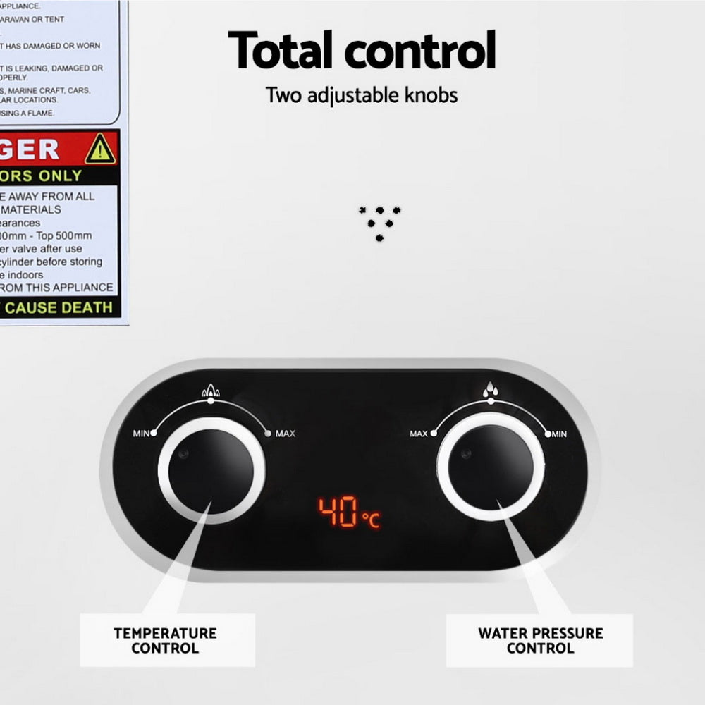 Experience the luxury of a warm shower in the great outdoors with the Devanti Gas Water Heater. This versatile and efficient outdoor showering solution offers convenience, heating up to 360L of water per hour at your preferred temperature, clearly displayed on its LED screen. Safety is paramount, with a built-in processor limiting the maximum water temperature to 60°C, to help preventing any accidents. The showerhead features an automatic on/off trigger for easy operation, while a variety of additional safety features ensure worry-free use. Designed for portability and ease of use, the Devanti Gas Water Heater comes equipped with a handy carry handle and all necessary mounting brackets for quick and hassle-free setup. Its lightweight construction makes it ideal for camping trips, beach outings, or any outdoor adventure where a warm shower is desired. With both winter and summer settings and adjustable water flow this LPG-powered heater offers a perfect blend of comfort and practicality for outdoor enthusiasts. Enjoy the freedom of the open country without sacrificing the comfort of a warm shower – the Devanti Gas Water Heater is your perfect outdoor companion.