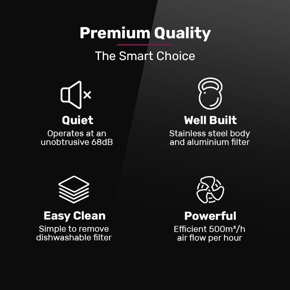 Running at just 68dBa, it remains quiet, even at top speed. The simple three-speed push button control allows for quick adjustments, and the three-layer aluminium filter is both removable and dishwashable for hassle-free maintenance.