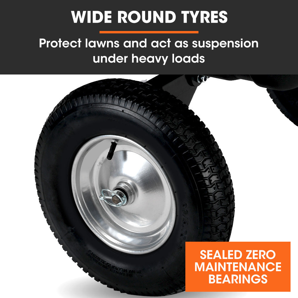 The large 16' pneumatic tyres are mounted on 8-inch steel rims. They are attached to independent axles for higher ground clearance and have maintenance-free sealed bearings. They are ideal for carting loads through soil, mud and rough terrain without sinking or getting hung up on logs and boulders. And, with a 4-inch tread width they are kind to turf based surfaces.