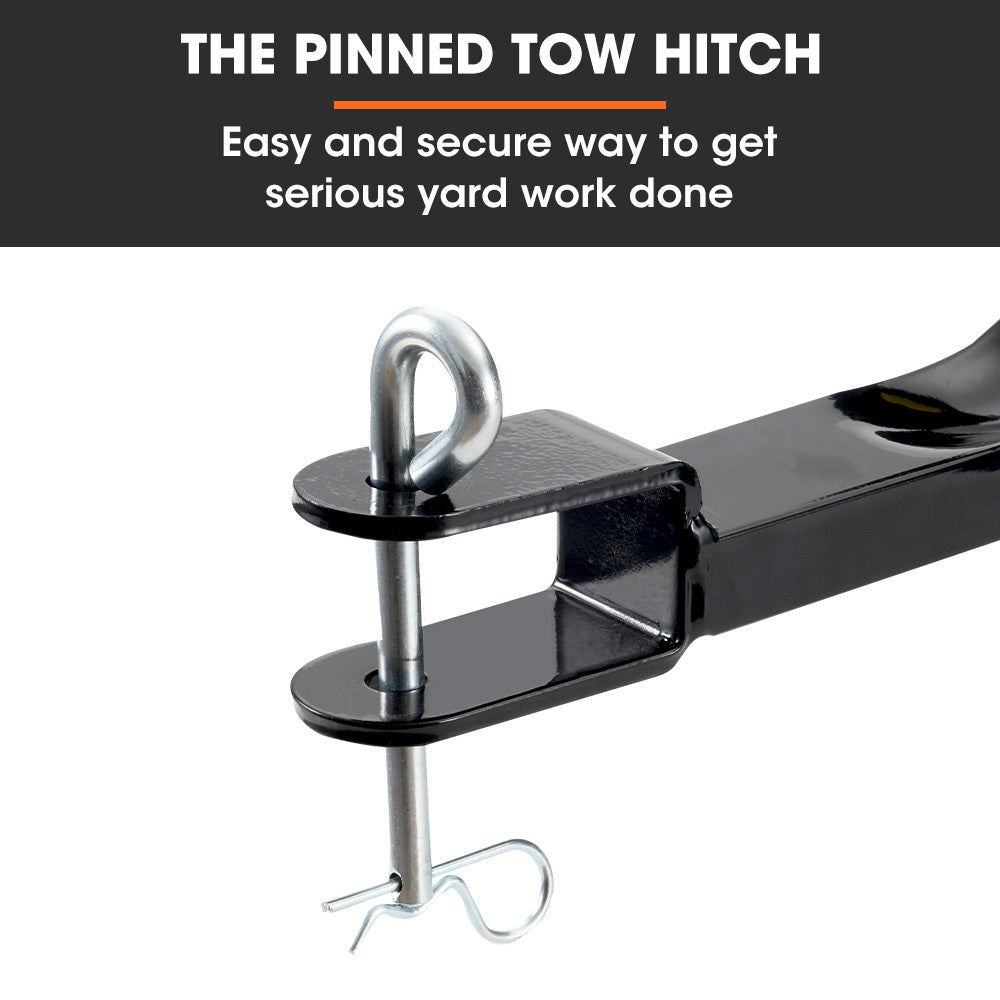 The pin-style hitch hooks up to tow plates commonly found on lawn tractors, ride-on mowers and some ATVs.