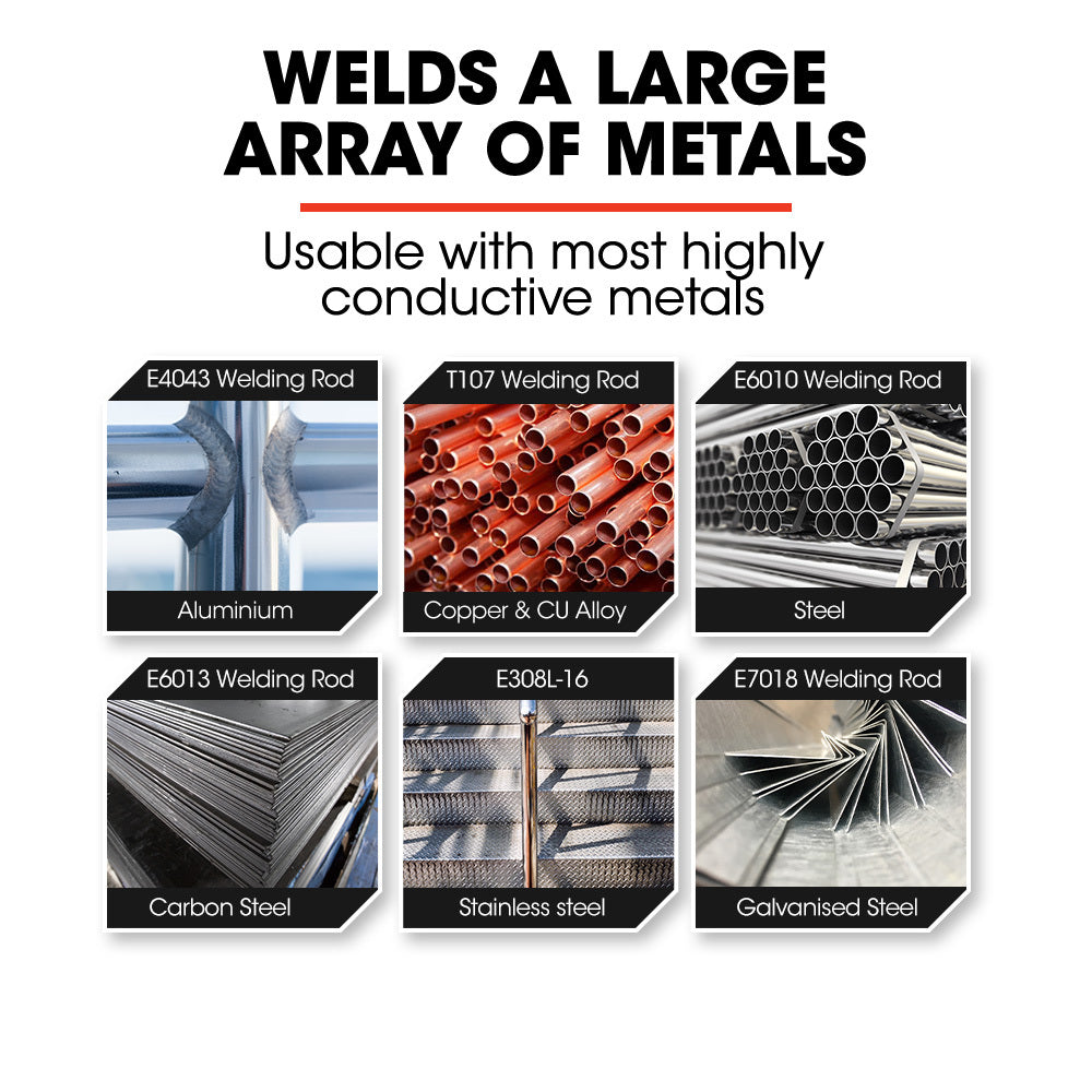 - Compatible Metal and Electrode: Aluminium (E4043), Copper (T107), Steel (E6010), Carbon Steel (E6013), Stainless Steel (E308L-16), Galvanised Steel (E7018)