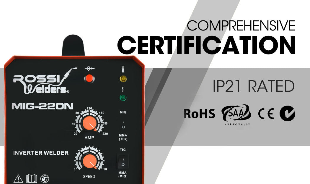 The new ROSSI MIG-220N Gas/Gasless Inverter Welder is capable of welding or joining just about anything. The MIG-220N handles MIG/TIG and MMA/ARC/Stick producing smooth accurate work - the MIG-220N is the master of metals!